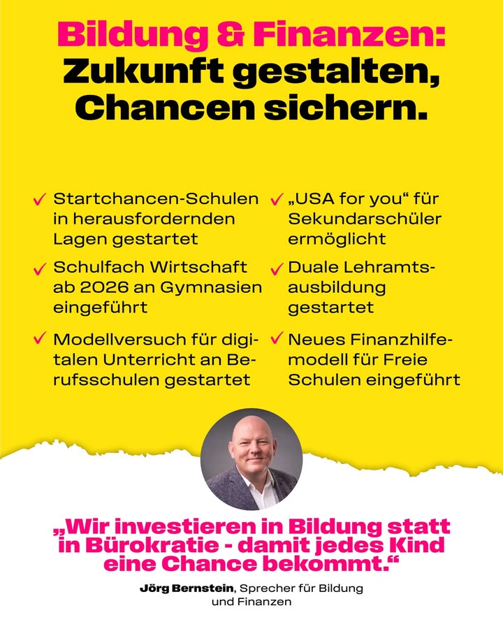 Schülerinnen und Schüler sollen in Sachsen-Anhalt an den besten Schulen den besten Unterricht erhalten. Darum stärken wir Wahlfreiheit, Qualität und Eigenverantwortung. 🏫 Mit dem Startchancenprogramm unterstützen wir Schulen dort, wo die sozialen Herausforderung am größten sind. 🤝 Lehrkräften, die heute mehr Unterricht geben möchten, haben wir den Weg dafür frei gemacht. 👩🏫 20.000 Schülerinnen und Schüler profi tieren von der neuen, fairen Finanzierung der Schulen in Freier Trägerschaft. ✅ Unsere Hochschulen mit Millionen für die digitale Lehre modernisiert. 💻🚀 Das Schulfach Wirtschaft bereitet unsere Schüler ab 2026 auf das Leben vor und fördert unternehmerisches Denken. 📈💡 Das duale Lehramtsstudium bringt Lehrkräfte schon während ihrer Ausbildung an die Schulen und bereitet sie auf die Praxis vor. 🎓 Digitales Lernen ist Bestandteil der Schullandschaft und kann verantwortungsvoll eingesetzt werden. 🌐📱 #bildung #sachsenanhalt #schule #lehrkräfte #zukunft