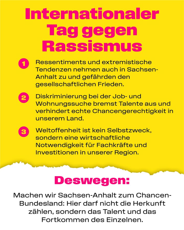 Rassismus ist das Gegenteil von Freiheit. Wer Menschen nach ihrer Herkunft beurteilt, statt nach ihrem Charakter und ihrem Talent, verbaut nicht nur Einzelnen den Weg, sondern schadet uns als gesamter Gesellschaft. In Sachsen-Anhalt brauchen wir jeden Kopf und jede zupackende Hand. Wir kämpfen für eine echtes Chancen-Bundesland, in der das individuelle Fortkommen zählt, unabhängig von der Biografie. Setzen wir gemeinsam ein Zeichen für Weltoffenheit und gegen jede Form von Ausgrenzung. #fdp #sachsenanhalt #chancenland #freiheit #weltoffenheit