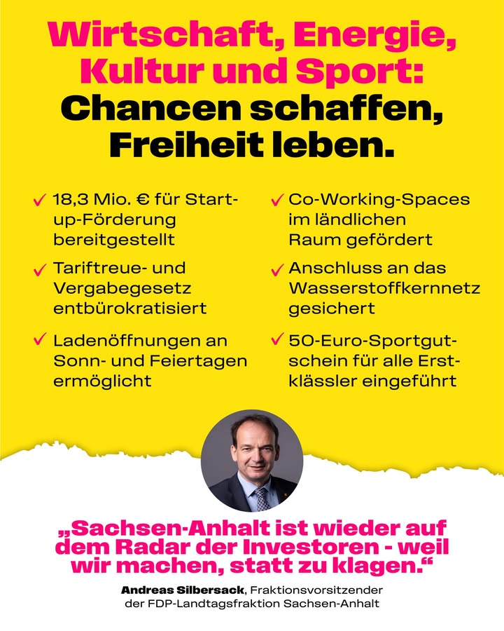 Wirtschaftliche Stärke entsteht, wenn Politik nicht im Weg steht, sondern den Weg frei macht. 🚀 Deshalb haben wir Hürden abgebaut, Spielräume erweitert und Impulse gesetzt, damit Sachsen-Anhalt auch morgen Industrieland bleibt – und Zukunftsland wird. Das Tariftreue- und Vergabegesetz haben wir vereinfacht und praxistauglich gemacht. Damit ermöglichen wir leichtere Aufträge für den Mittelstand und kleinere Unternehmen. 💼🤝 Auch die Öffnung vollautomatisierter Läden an Sonn- und Feiertagen zeigt: Wir vertrauen auf Eigenverantwortung statt auf Verbote. 🛒🔓 Und mit gezielten Investitionen in den Sport – von Infrastruktur bis Nachwuchsförderung – stärken wir Gemeinschaft, Gesundheit und Leistung gleichermaßen. #wirtschaft #mittelstand #innovation