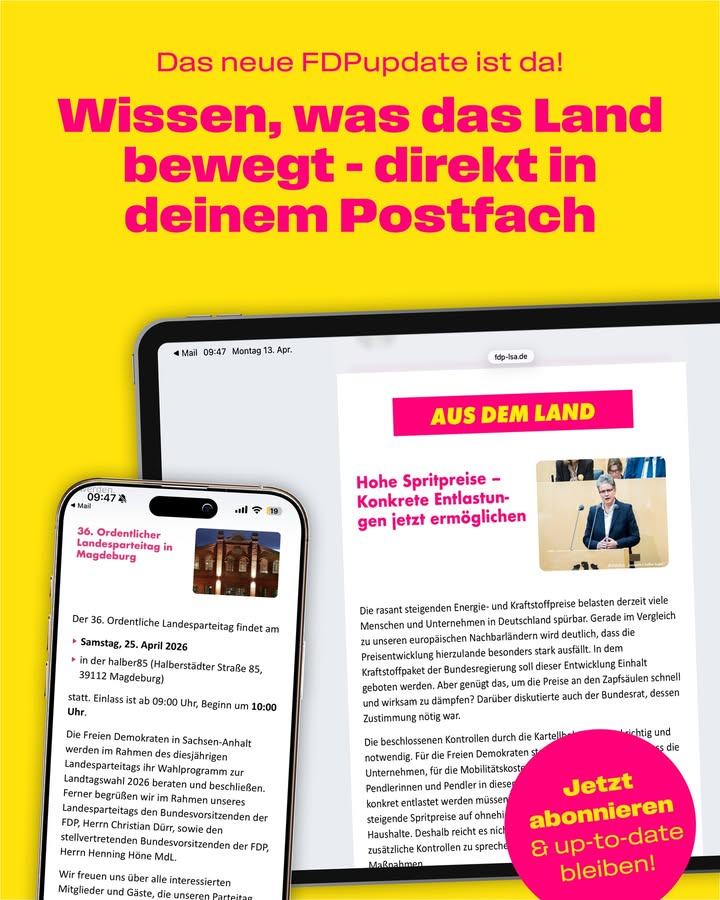Das neue FDPupdate ist da! 🚀 Egal ob News zum Landesparteitag in Magdeburg oder aktuelle Forderungen zu Spritpreisen und Entlastungen. Mit unserem Newsletter erfährst du als Erstes, was sich in Sachsen-Anhalt bewegt. Keine Lust auf lange Suchen? Dann hol dir die Infos direkt in dein Postfach. 📩 👉 Jetzt abonnieren auf: fdp-lsa.de #fdp #fdpupdate #news