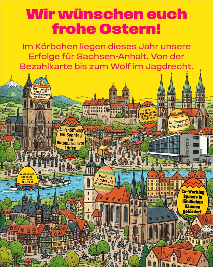 Egal, ob für dich heute die christliche Botschaft im Mittelpunkt steht oder ob du einfach den Sonntag genießt und dich mit der Familie auf Eiersuche begibst: Wir wünschen euch allen ein wunderschönes, erholsames und, für alle, die es begehen, ein gesegnetes Osterfest! In unserem Wimmelbild aus Sachsen-Anhalt haben wir dieses Jahr ein paar ganz besondere Ostereier für euch versteckt. 🥚🔍 In jedem Ei steckt eine Reform oder ein Erfolg, die wir unter anderem für euch erreicht haben, von der Bezahlkarte bis zum Wolf im Jagdrecht. Findet ihr alle 7 Reform-Eier zwischen dem Magdeburger Dom und dem Harz? 🧐 Schreibt uns mal in die Kommentare, welches dieser Themen euch für Sachsen-Anhalt am wichtigsten ist! 👇
